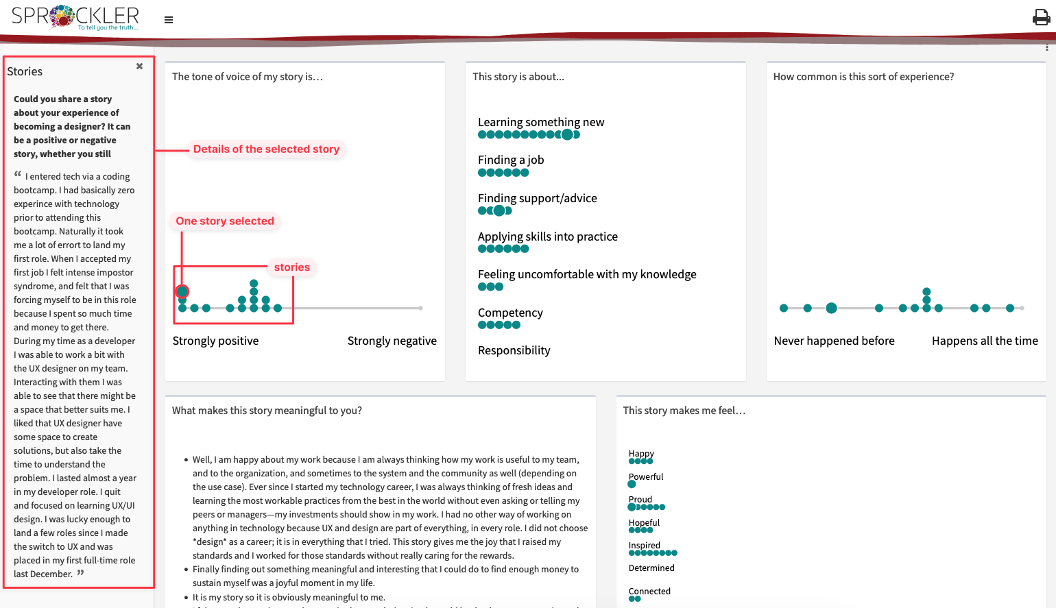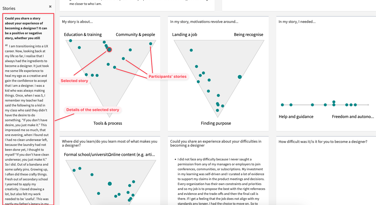 Example of narrative research using Sprockler, collecting stories on the theme of “becoming a designer” – source